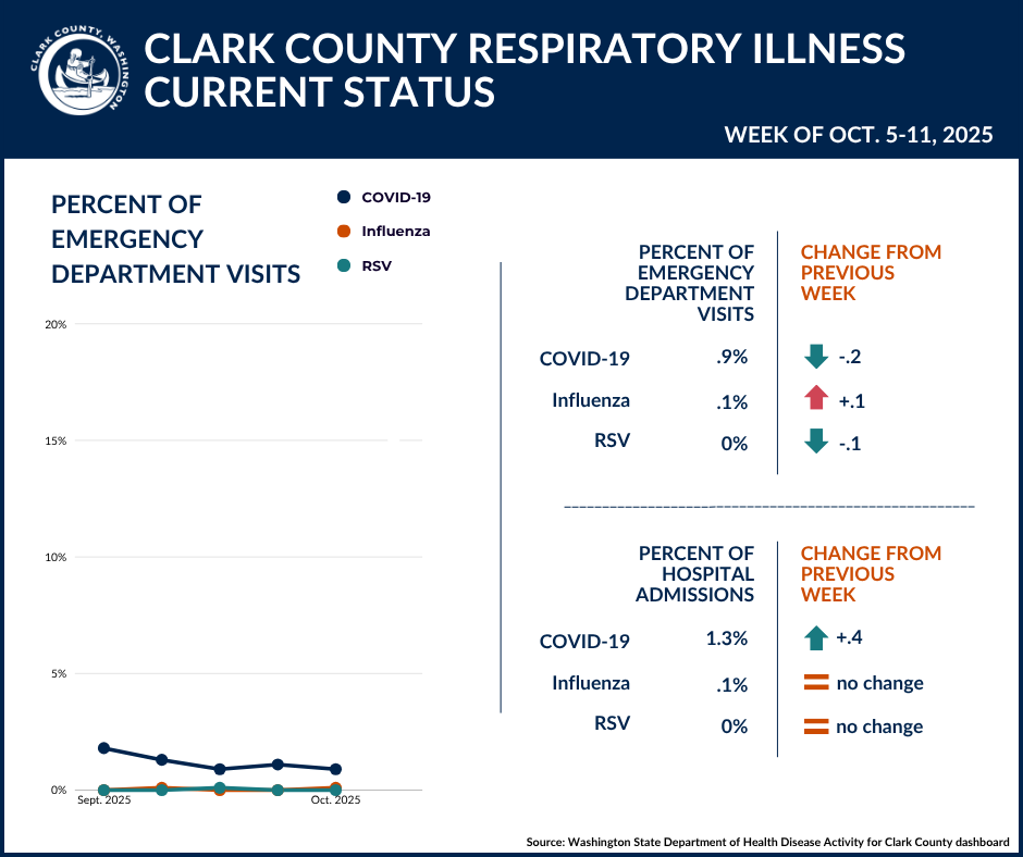 Clark County Public Health updates COVID-19, influenza and RSV data each week throughout respiratory illness season using data from the Washington State Department of Health. All data is preliminary and may change. For state and regional data, visit the state Respiratory Illnesses Data Dashboards. |